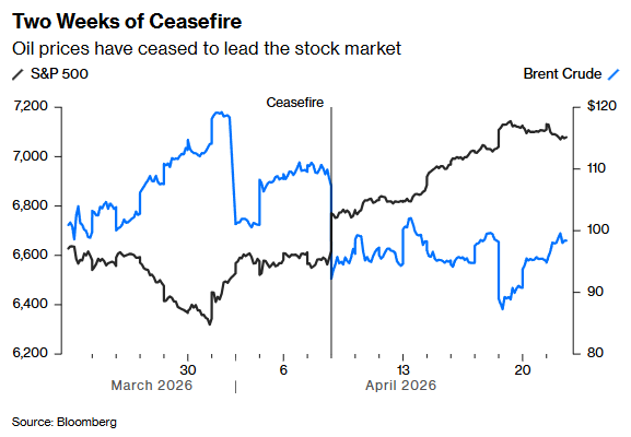 원유 가격은 급등하며 브렌트유가 7거래일 만에 처음으로 배럴당 100달러를 돌파했다. 그러나 유가와 미국 주식 간의 역의 상관관계는 휴전 발표가 있었던 2주 전에 이미 깨졌다. 이후에는 호르무즈 해협 봉쇄가 계속되든, 평화 협상이 진전되든 안되든, 어떤 요인도 그 관계를 되돌리지 못했다. 유가가 급등했음에도 불구하고, 주식은 비교적 제한적인 하락에 그치며 균형을 이루는 모습이었다: