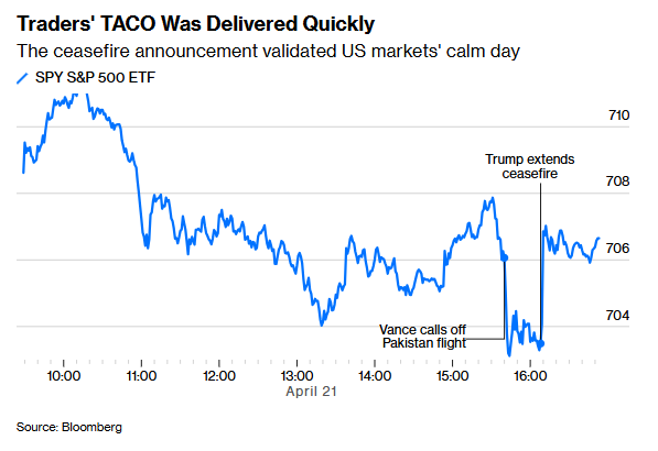 이러한 해석을 확인이라도 해주듯, 밴스의 방문이 취소됐다는 악재가 나온 지 불과 30분 만에 트럼프는 이란이 새로운 제안을 내놓을 때까지 휴전을 무기한 연장하겠다고 발표했다. (marketwatch.com)