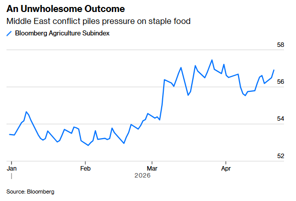 Points of Return가 이전에 지적했듯, 원유 공급 차질에만 집중하는 것은 이미 진행 중인 또 다른 중요한 위협, 즉 식량 안보 문제를 간과하게 만들 수 있다. 곡물 생산에 필수적인 걸프 지역의 비료 공급이 거의 나오지 않으면서, 농부들은 더 비싼 대체재에 의존하거나 전체 사용량을 줄일 수밖에 없는 상황이며 그 영향은 빠르면 수개월 내에 나타날 가능성이 크다. 가격이 얼마나 상승할지는 알 수 없지만, 우크라이나 전쟁 이후의 상황은 암울한 가능성을 시사한다. 참고로, 다음은 블룸버그 농산물 서브지수의 움직임이다: