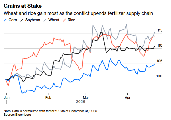 이는 여러 측면에서 우려를 낳는다. 이 지수는 기초 식량(staples)을 추적하기 때문에, 가격 상승의 부담이 광범위하게 확산될 가능성이 높다. 실제로 전쟁이 시작된 이후 밀과 쌀 가격이 상승하고 있다: