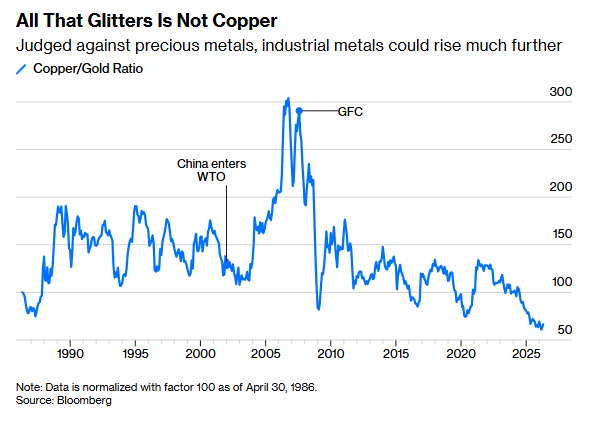 ‘금(안전자산)’이 과도하게 강하고, ‘구리(경기/산업)’는 역사적으로 저평가 상태