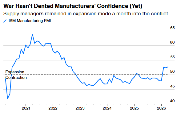 Oxford Economics는 2026년 남은 기간 동안 산업생산 성장률 전망을 하향 조정했지만, 여전히 전분기 대비 감소(마이너스 성장)는 나타나지 않을 것으로 보고 있다. 또한 전쟁 한 달 이후에도 기업 심리가 크게 훼손되지 않았음을 보여준 ISM 제조업 지표는 이러한 전망을 어느 정도 뒷받침하고 있다: