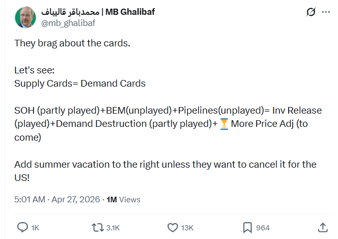 물론 이는 모두 이란의 입장에서 협상 레버리지를 높이기 위한 SNS를 통한 네거티브전 일환입니다. 그럼에도 위 트윗의 마지막 문장이 꽤나 인상적인데, 갈리바프는 다음과 같이 말합니다.,