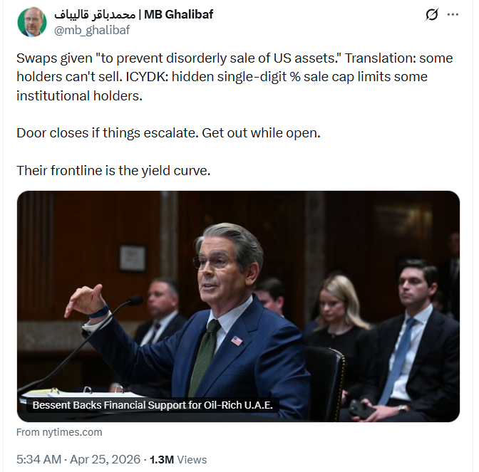이틀전 25일, 갈라바프 국회의장은 NY TIMES의 기사 원문을 링크하며 “UAE가 보유한 미국 자산의 무질서한 매도를 막기 위해 스왑라인이 제공됐다”는 문장은 다른 말로 표현하면 ‘일부 미국 자산 보유자들은 지금 팔 수 없다는 뜻’이라며 베센트의 스왑라인 제공을 직격한바 있습니다.