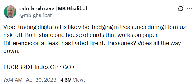 아시는 분들은 아시겠지만, 약 일주일 전인 4월 20일 갈라바프는 페이퍼 시장을 통한 오일 숏 포지션과 미국채 long 포지션이 얼마나 위험할 수 있는지를 아주 짧고 간결한 문장만으로 정확히 지적한바 있습니다.